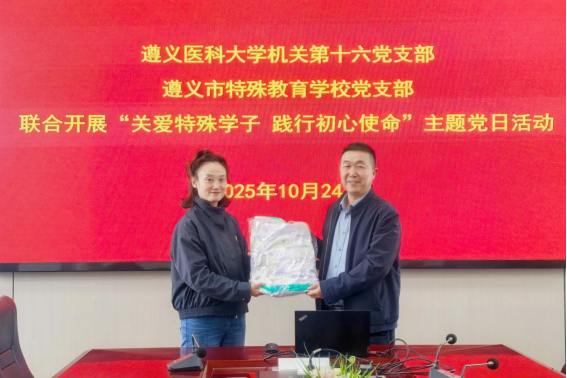 联学联做交流会上,党支部与遵义市特殊教育学校党支部共同学习了习近平总书记关于妇女儿童工作的重要指示精神及特殊教育相关政策文件;双方围绕特殊教育发展现状、学生康复训练与就业出路等深入交流,并就下一步合作新方向展开讨论;期间,党支部向特殊学校家庭经济困难学生捐赠了一批冬季衣物,送去关怀与温暖。随后,党支部实地参观了特殊教育学校的茶艺室、西点教室、花艺教室、手工室等教学阵地,切身感受特教工作的专业性与艰辛。