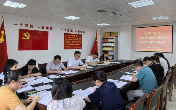 6月18日,机关第三党支部在行政楼801党员活动室开展“学党纪 明底线 强党性”党纪学习教育主题党日活动。活动由校党委副书记、组织部部长、统战部部长、机关第三党支部书记郭宇亮主持。