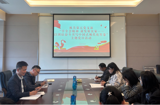 为深入学习领会党的二十届四中全会精神,切实把党员思想和行动统一到党中央决策部署上来,10月28日下午,机关第五党支部开展“学全会精神 谋发展实策——以团结奋斗书写中国式现代化答卷”主题党日活动。活动由支部书记付延功主持。